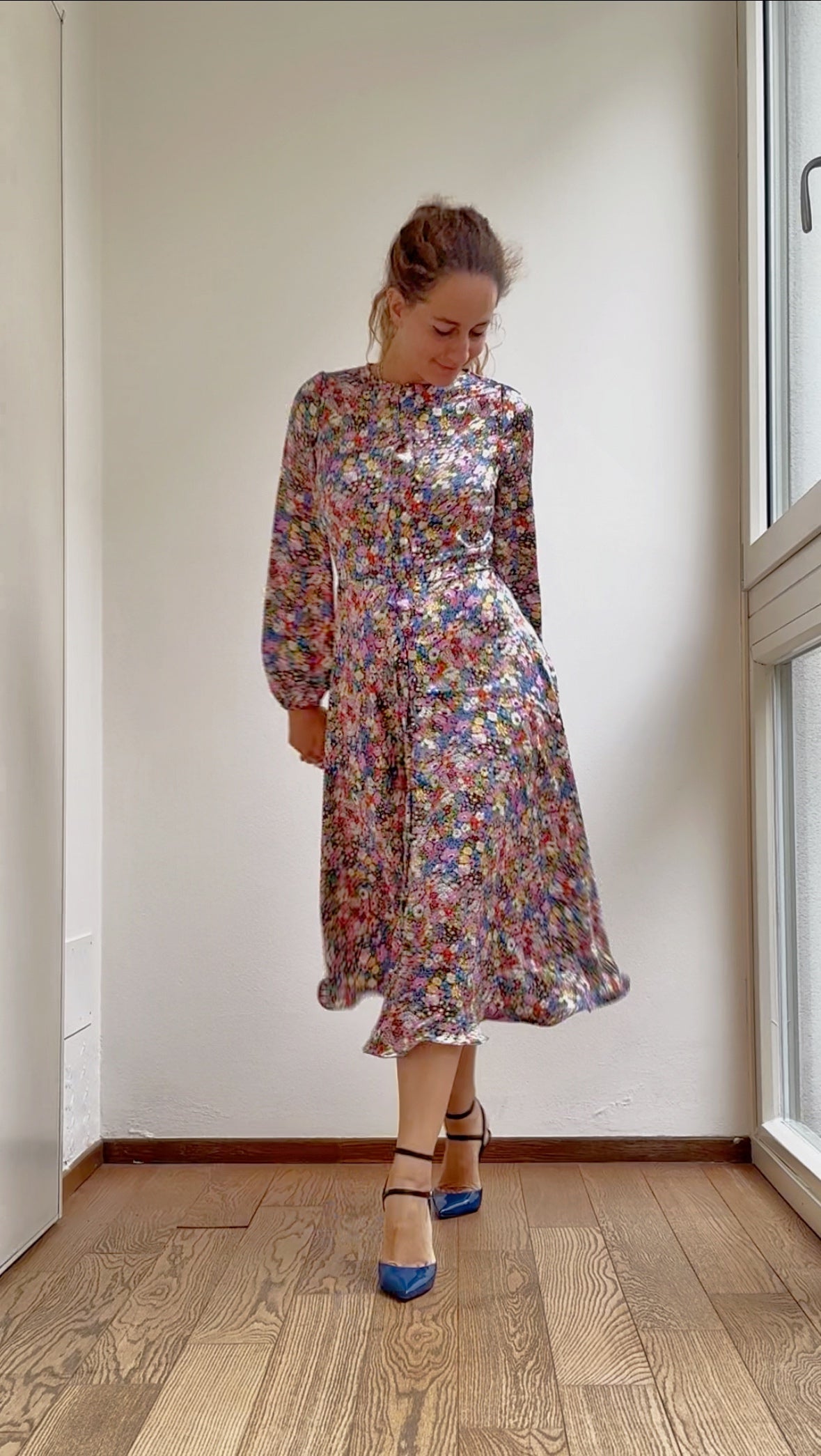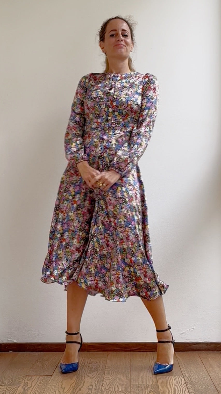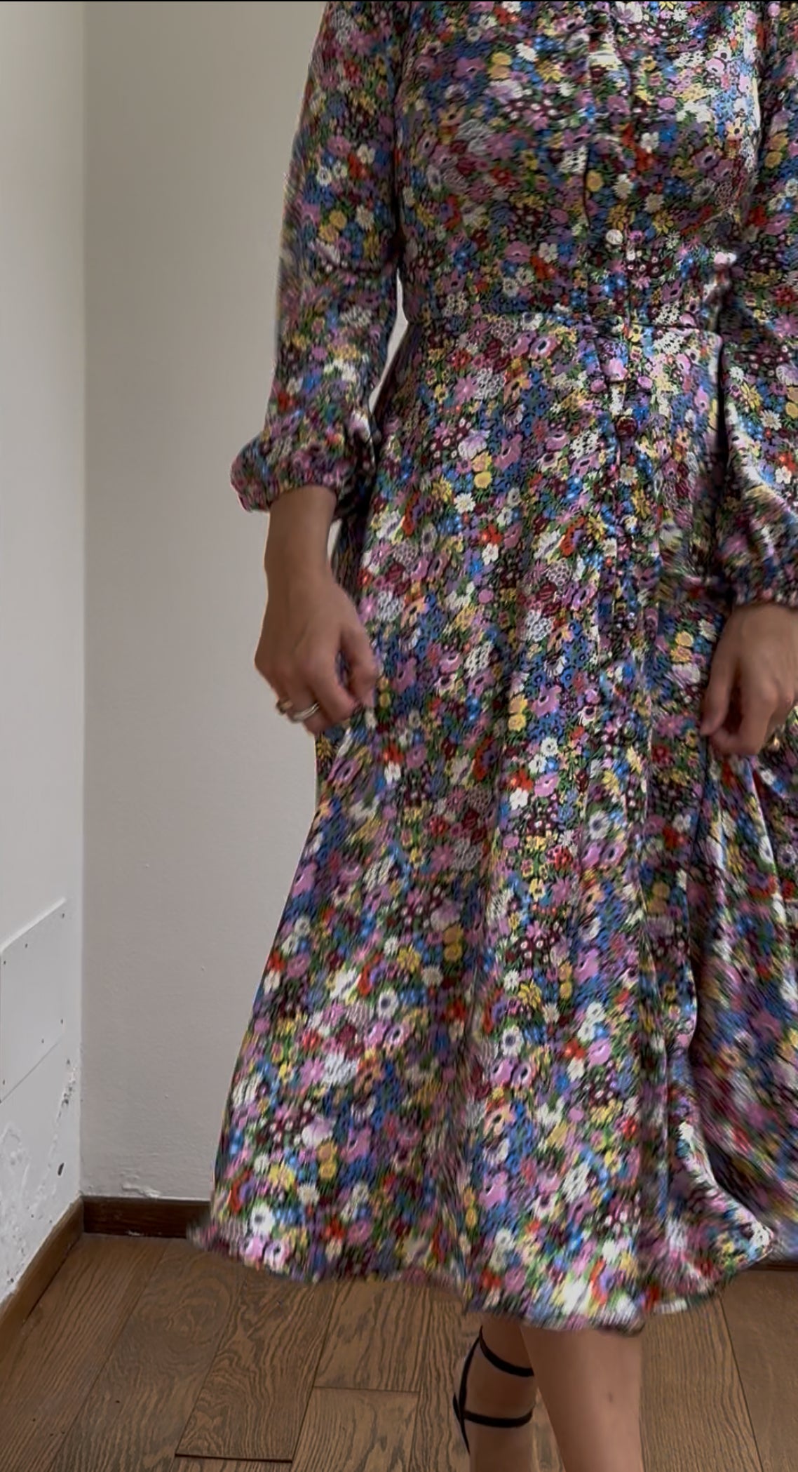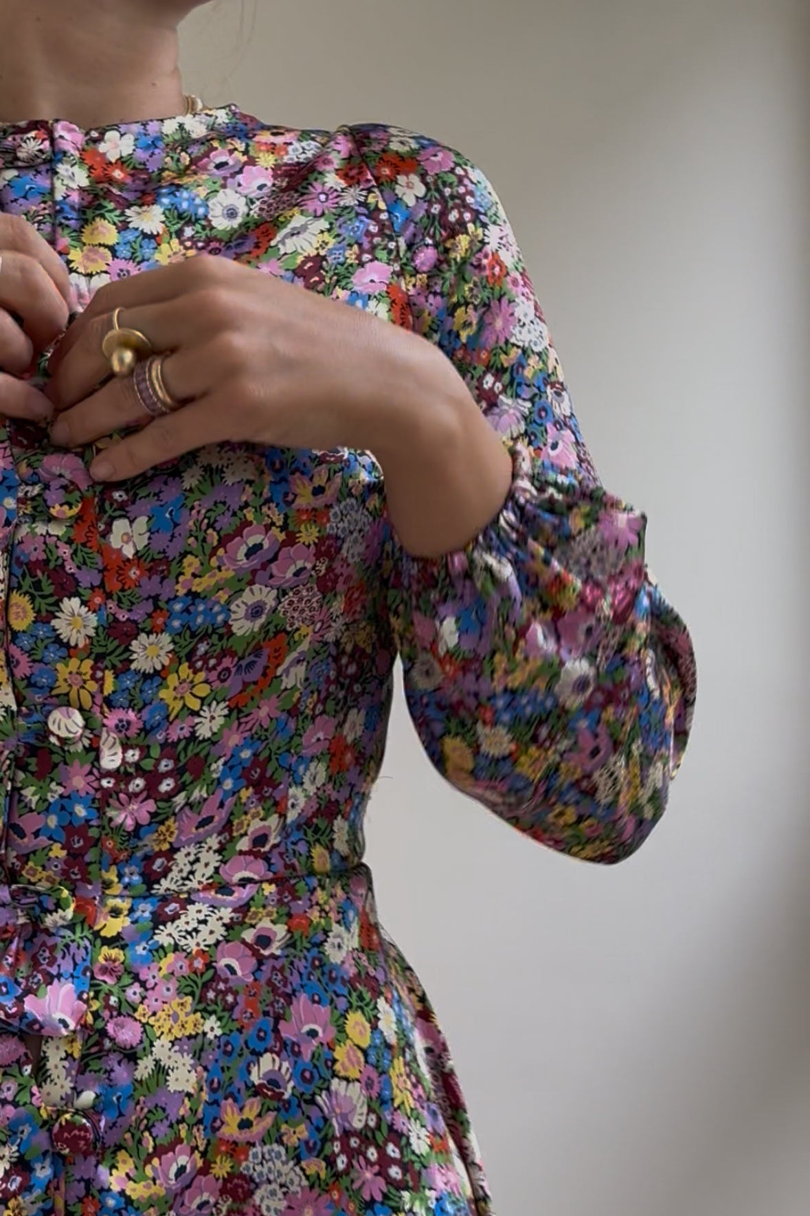 Abito dalle linee retrò in pura seta Liberty, allacciato frontalmente da una fila di bottoncini foderati a mano.