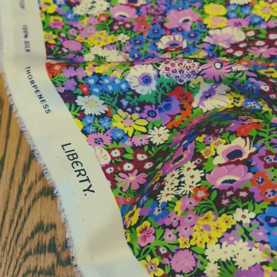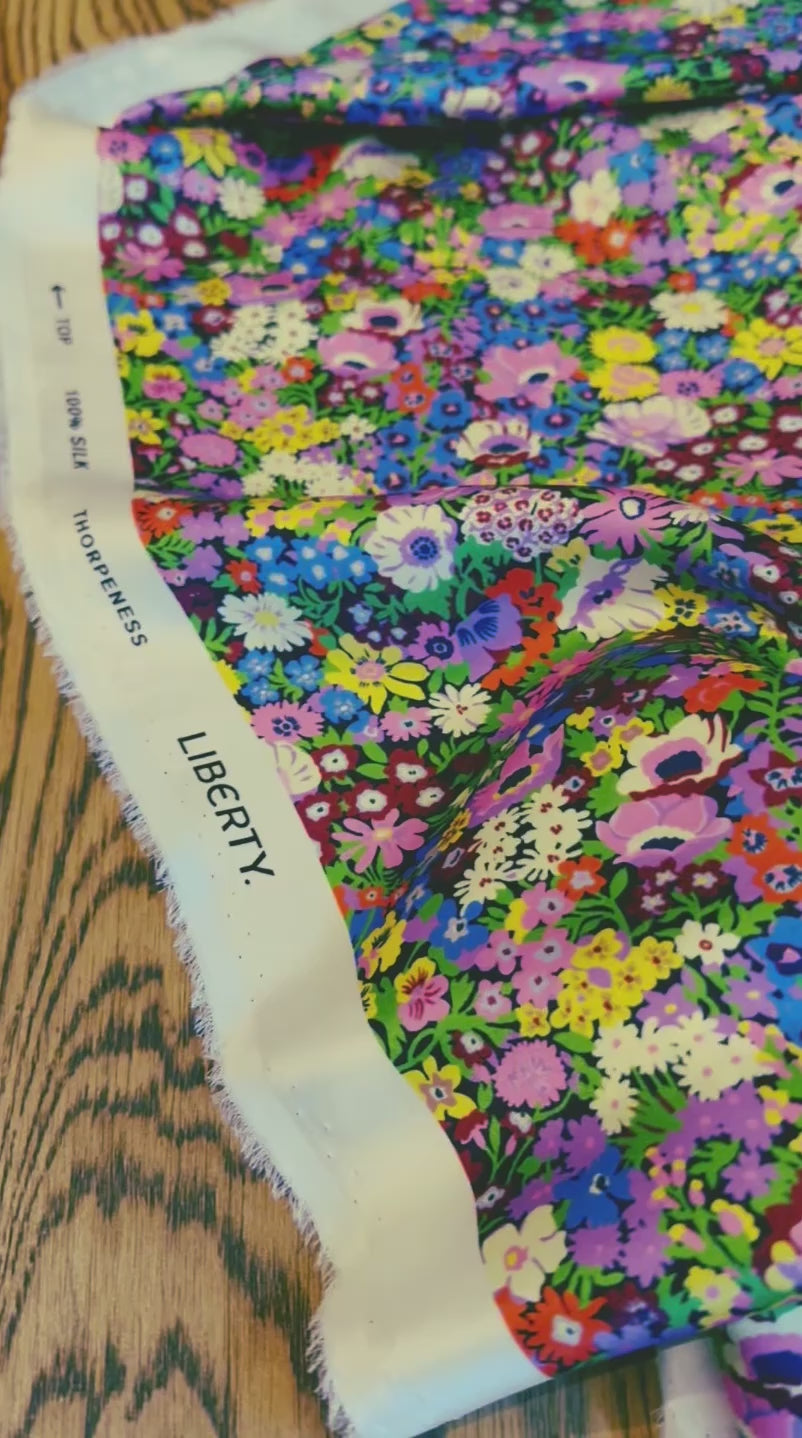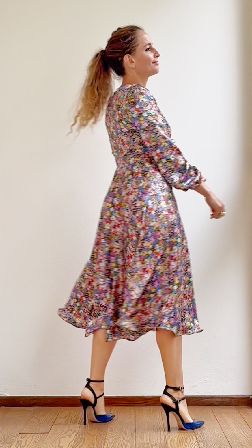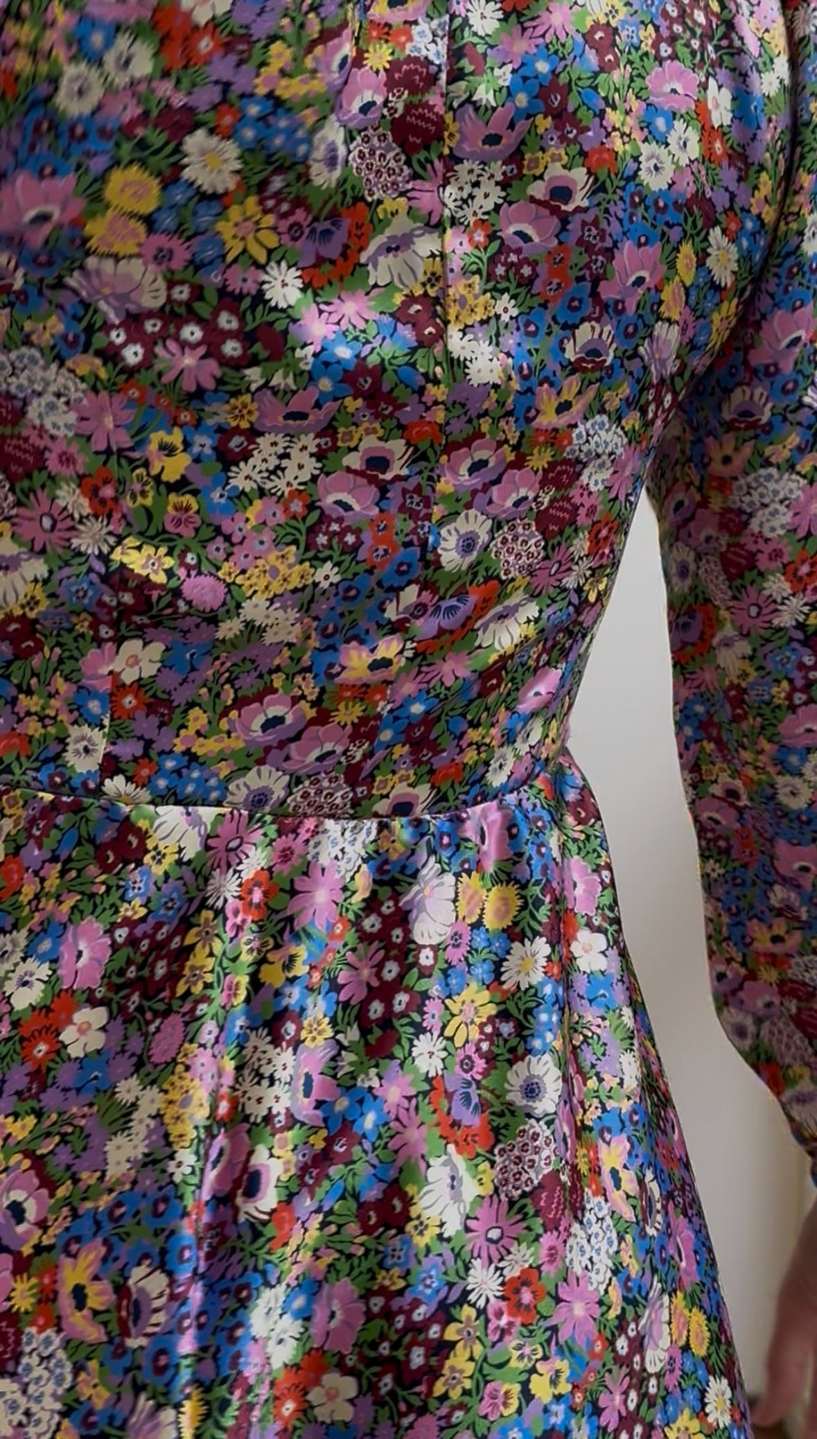 Abito dalle linee retrò in pura seta Liberty, allacciato frontalmente da una fila di bottoncini foderati a mano.