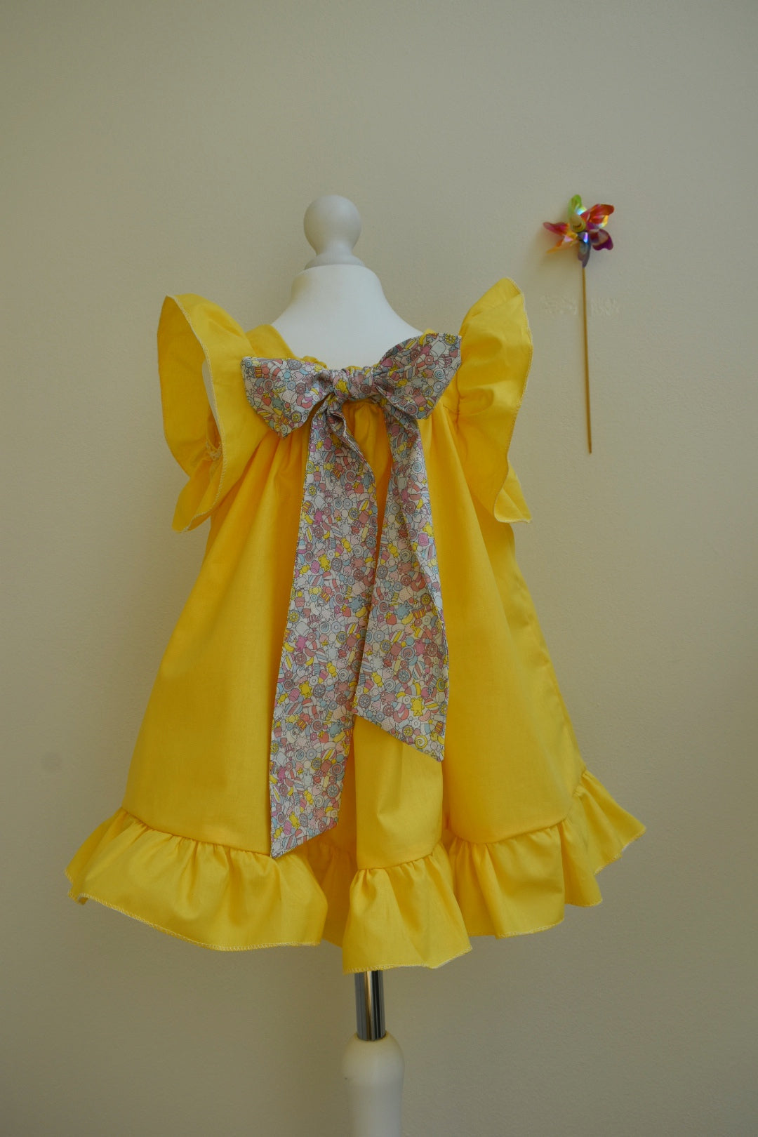 Abito leggero e vaporoso, in popeline di puro cotone, arricchito da maniche e orlo rouche e dal fiocco sulla schiena.