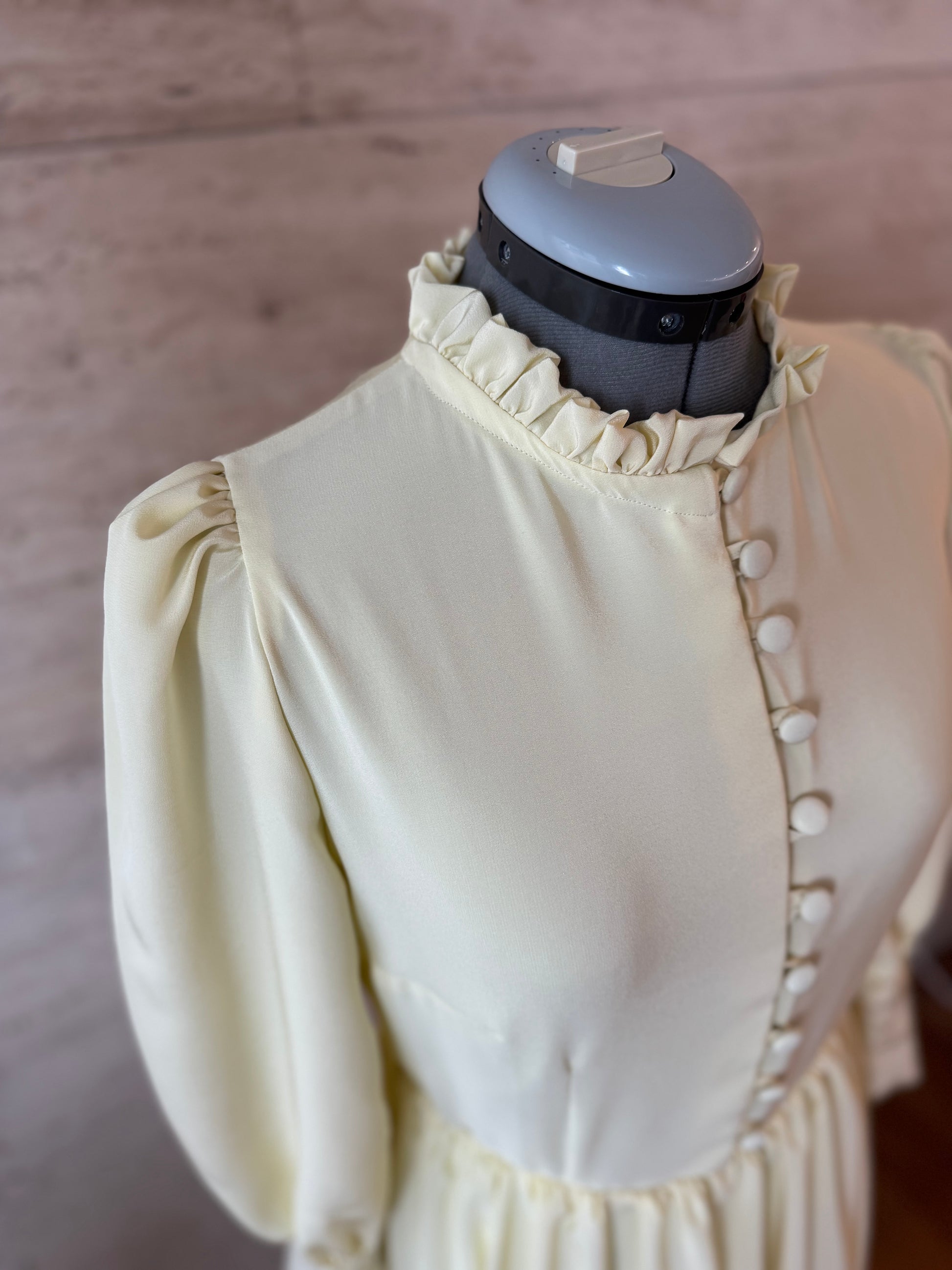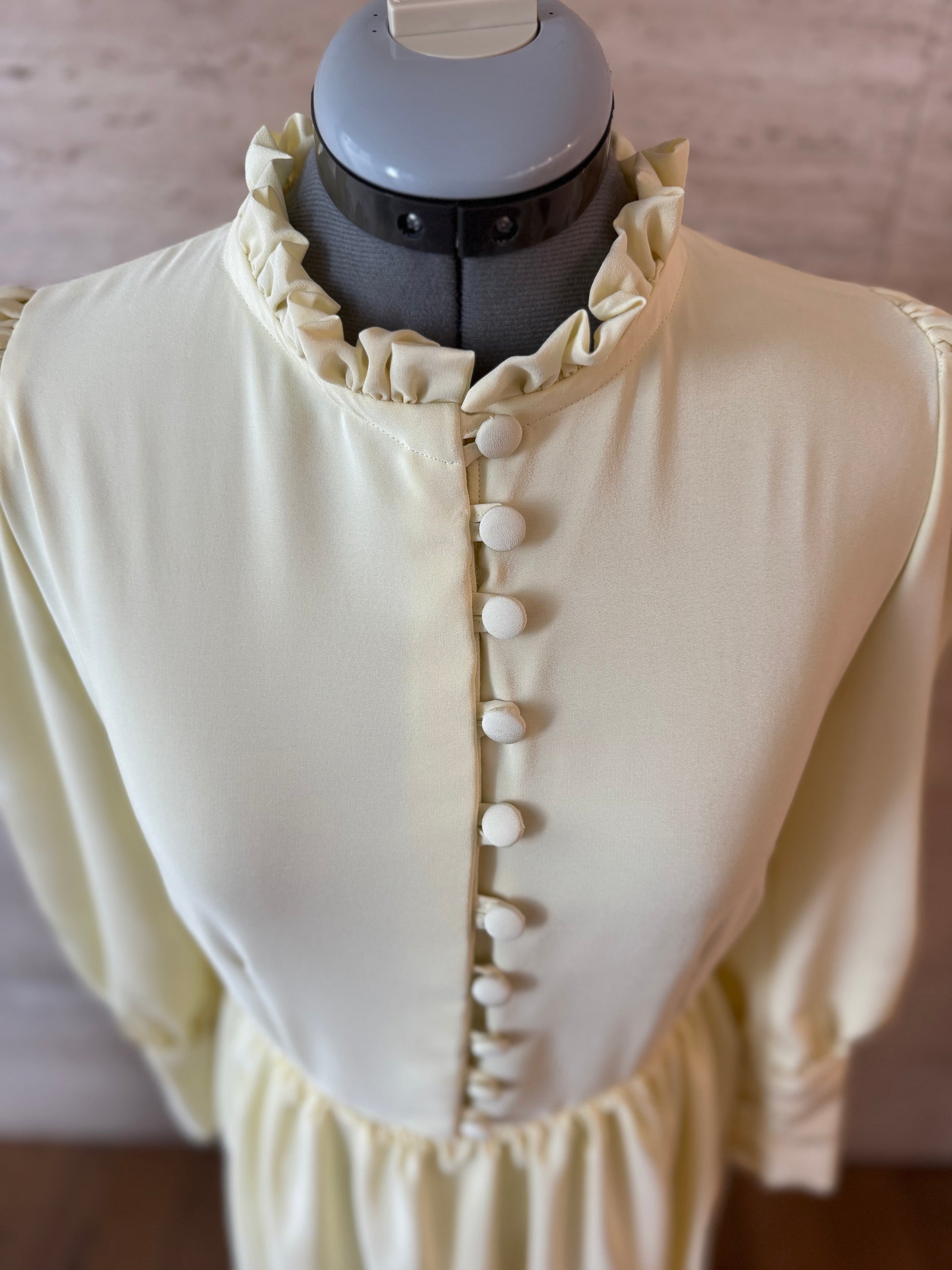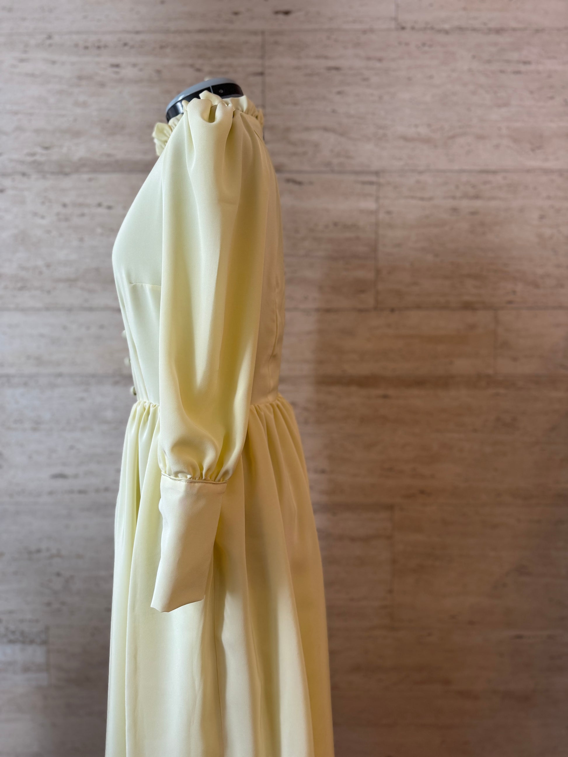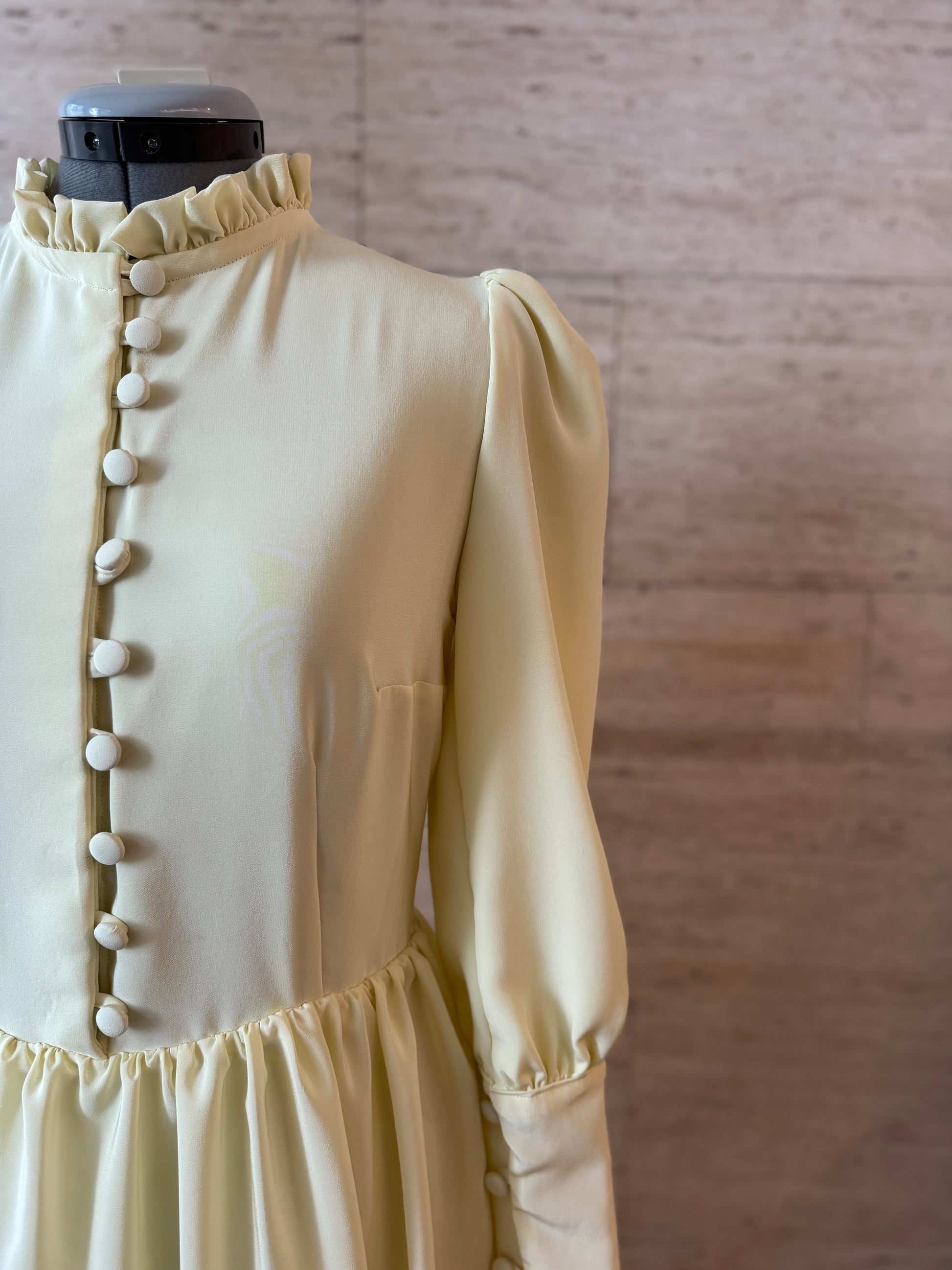 Abito in puro chiffon di seta, con bottoni foderati a mano, maniche a sbuffo e rouche sul girocollo.