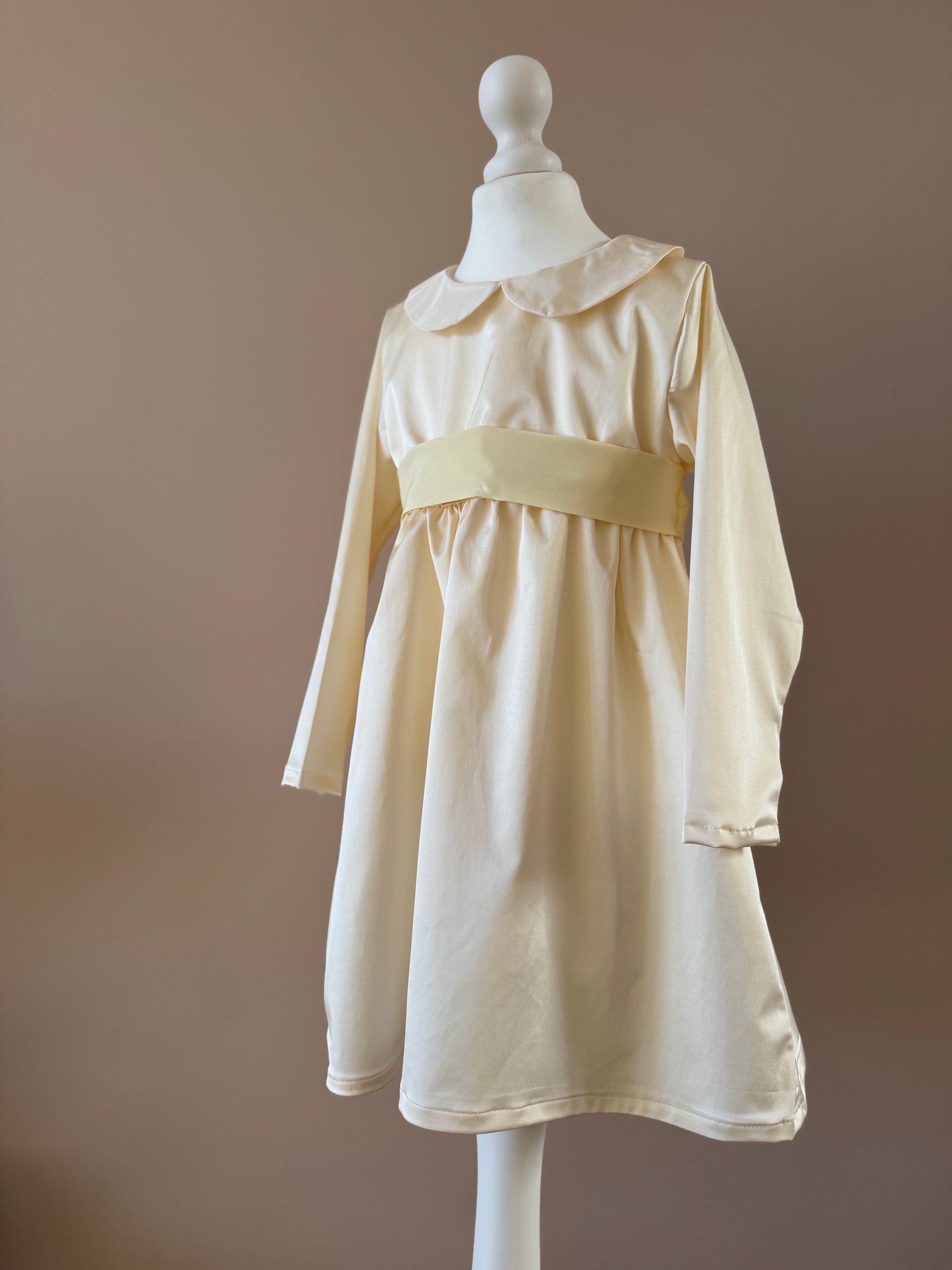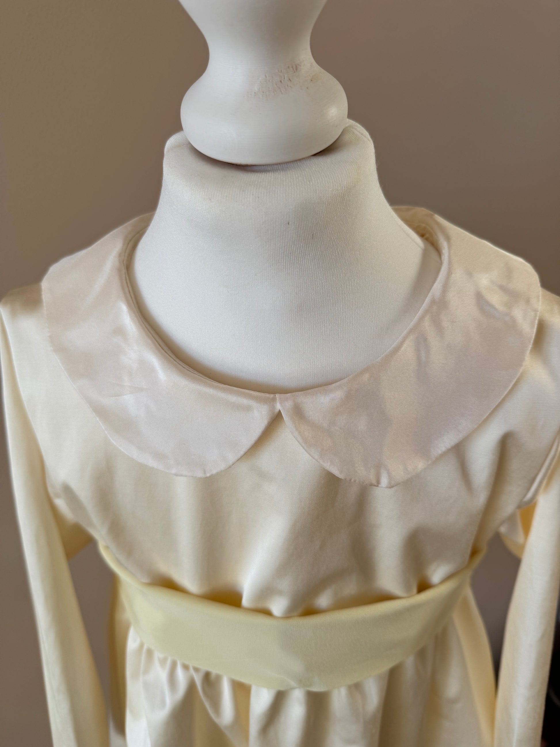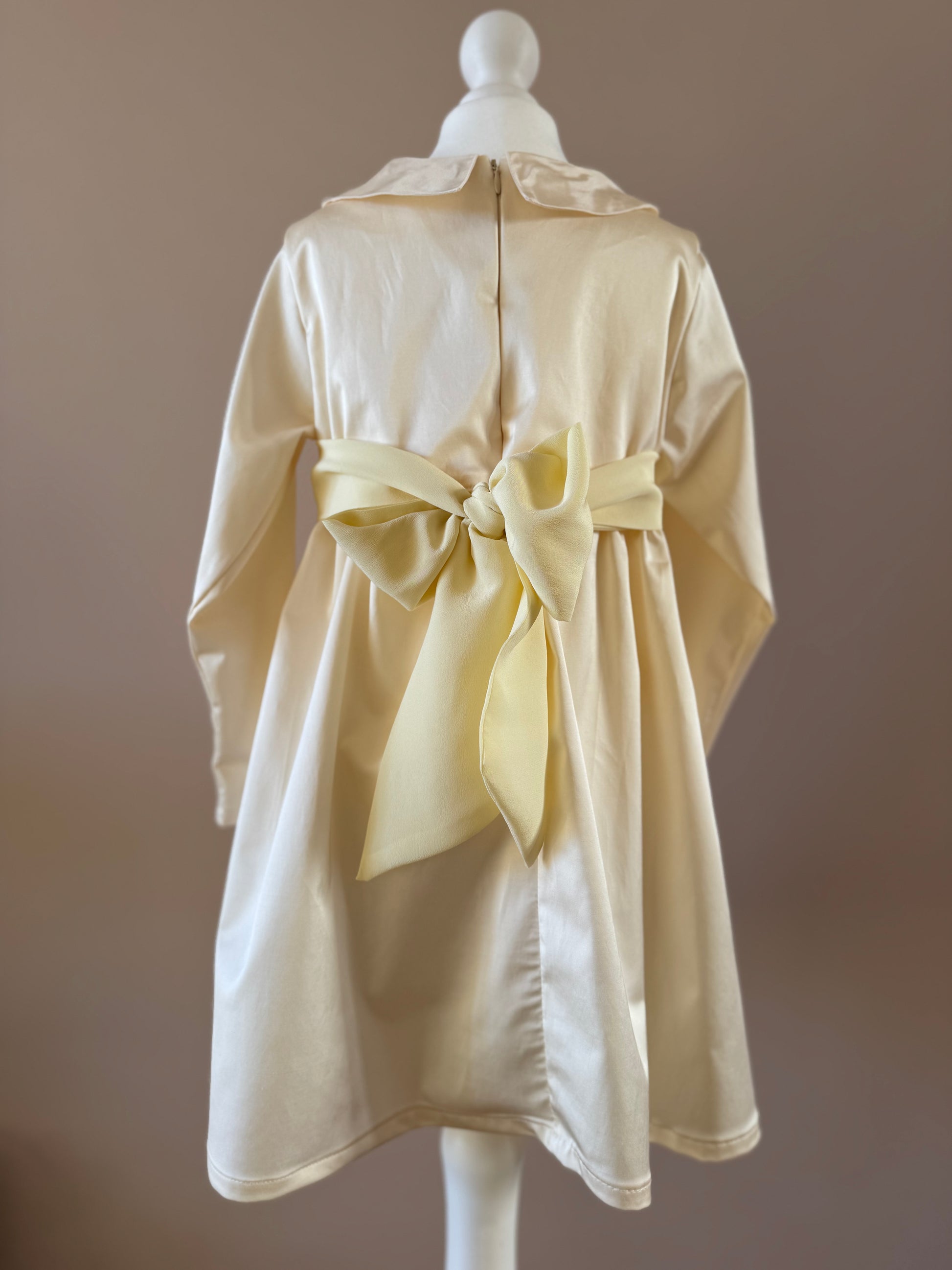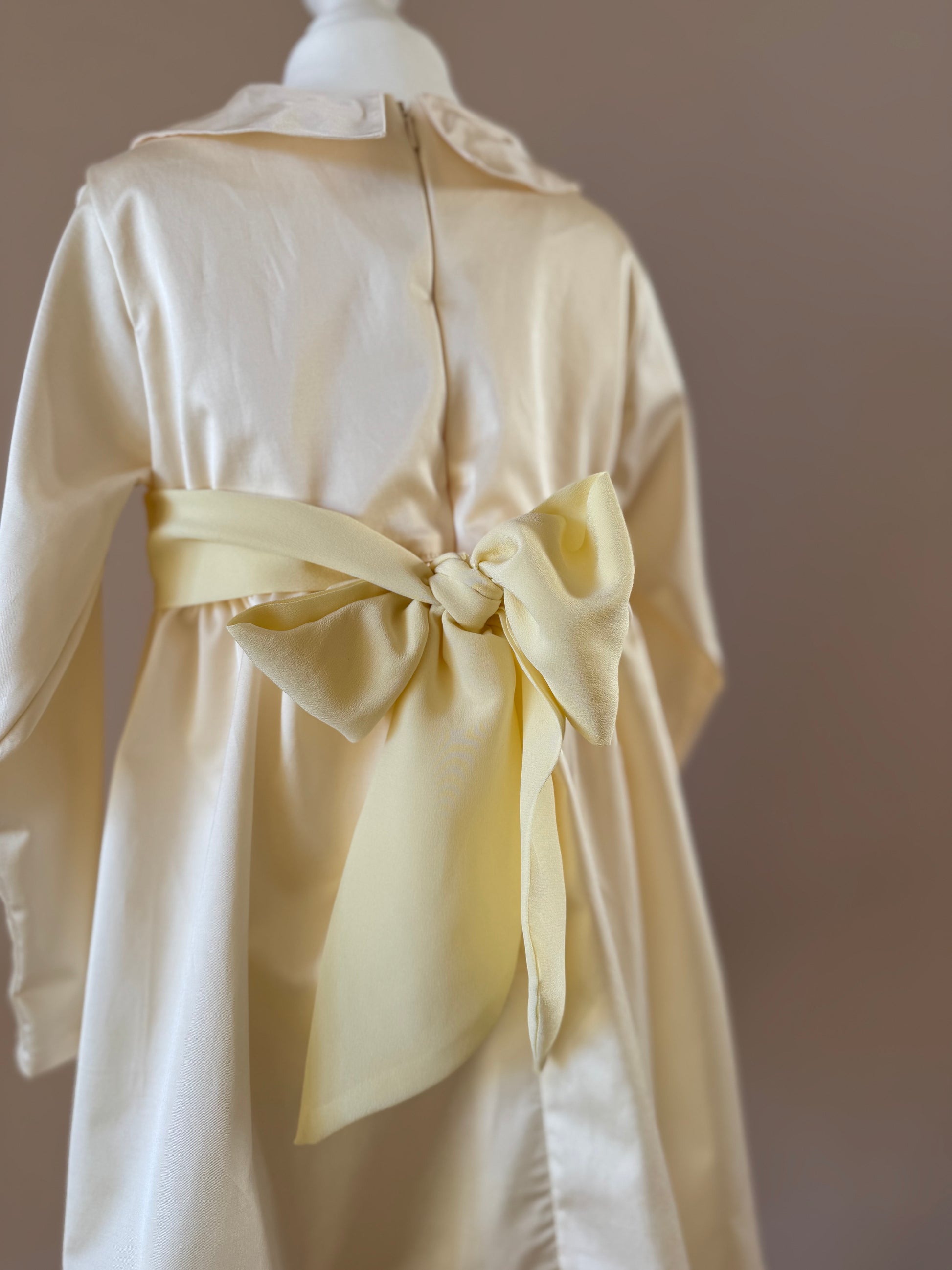 Abito in misto cotone e viscosa, con fiocco in chiffon si seta e colletto in taffetà di seta.