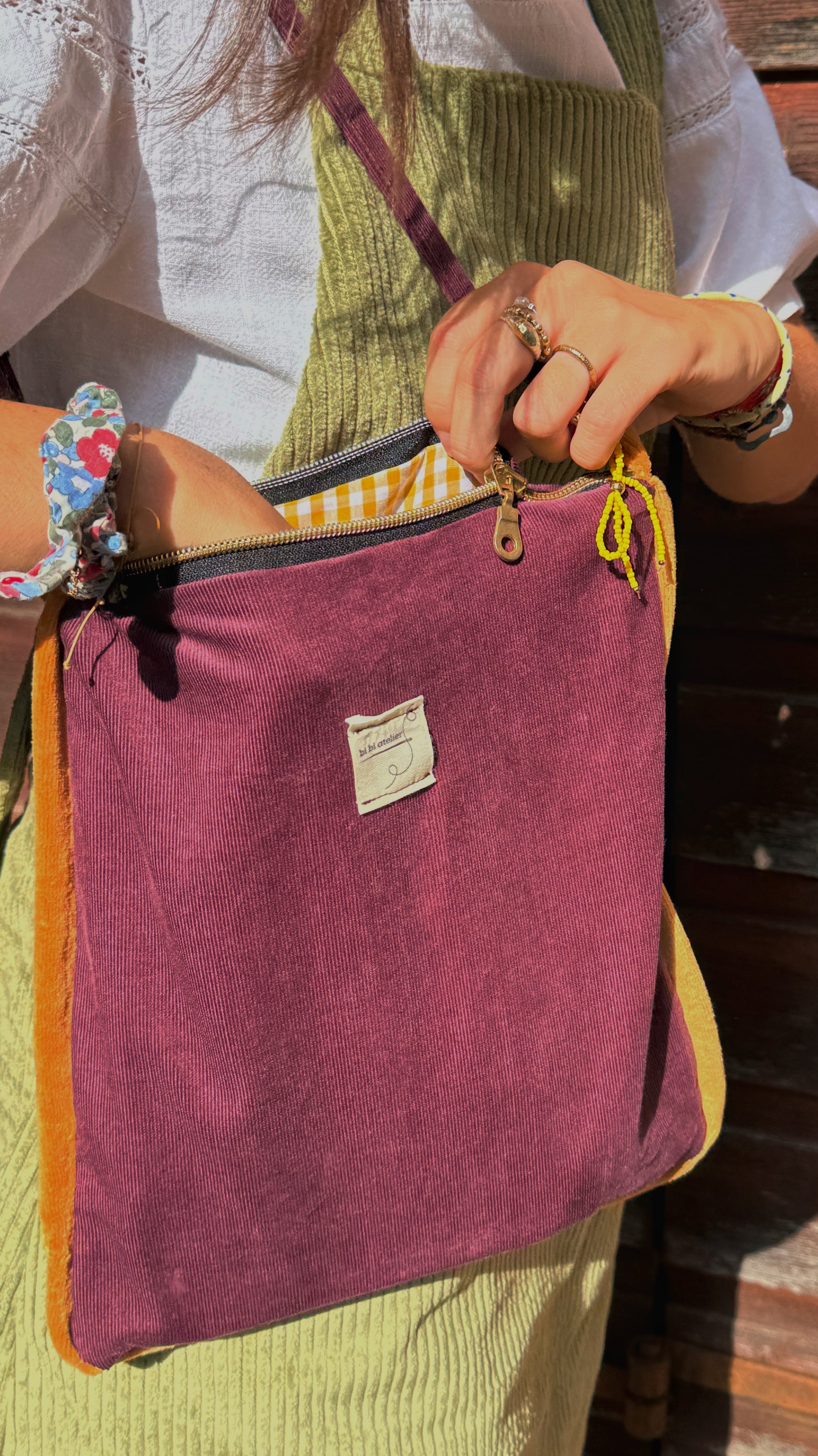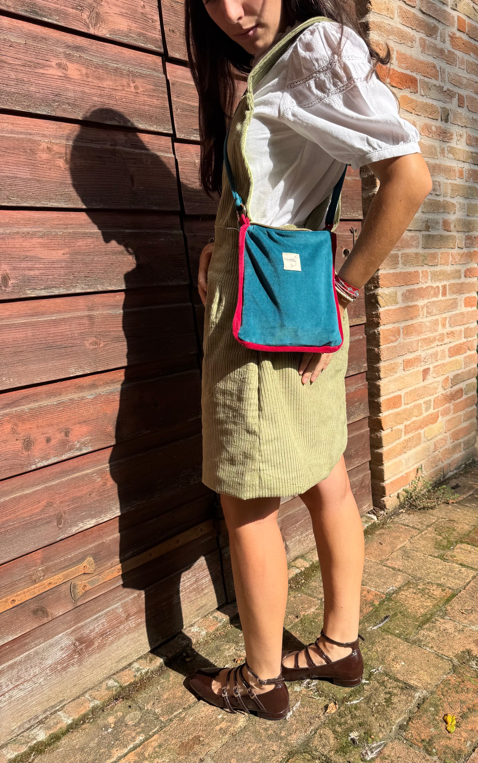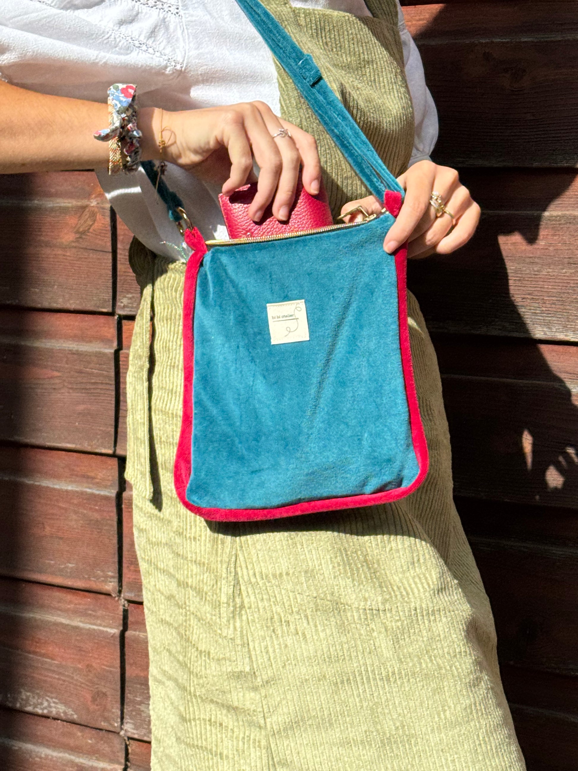 Borsa in morbido velluto di cotone foderata in vichy, con orlino a contrasto.