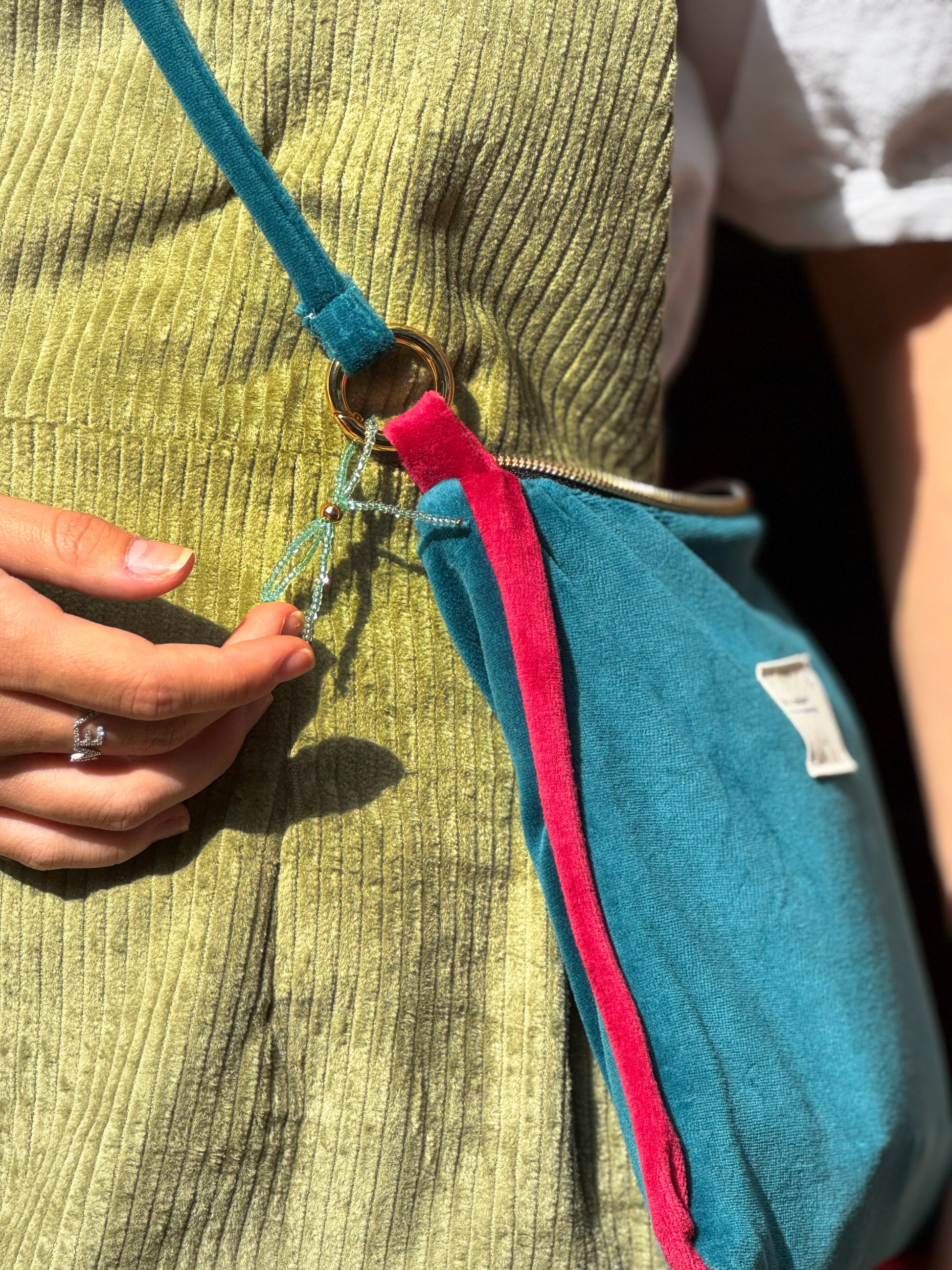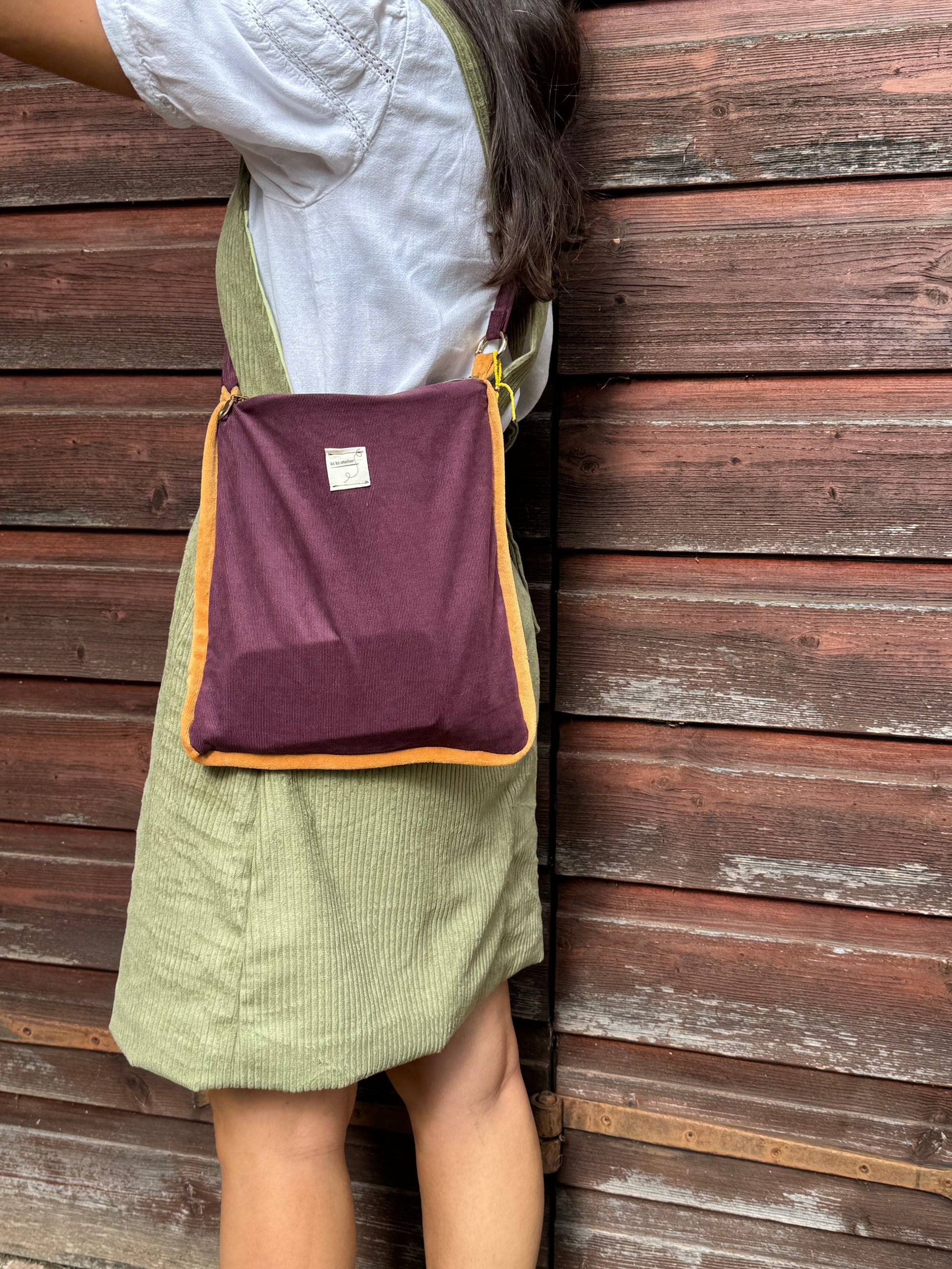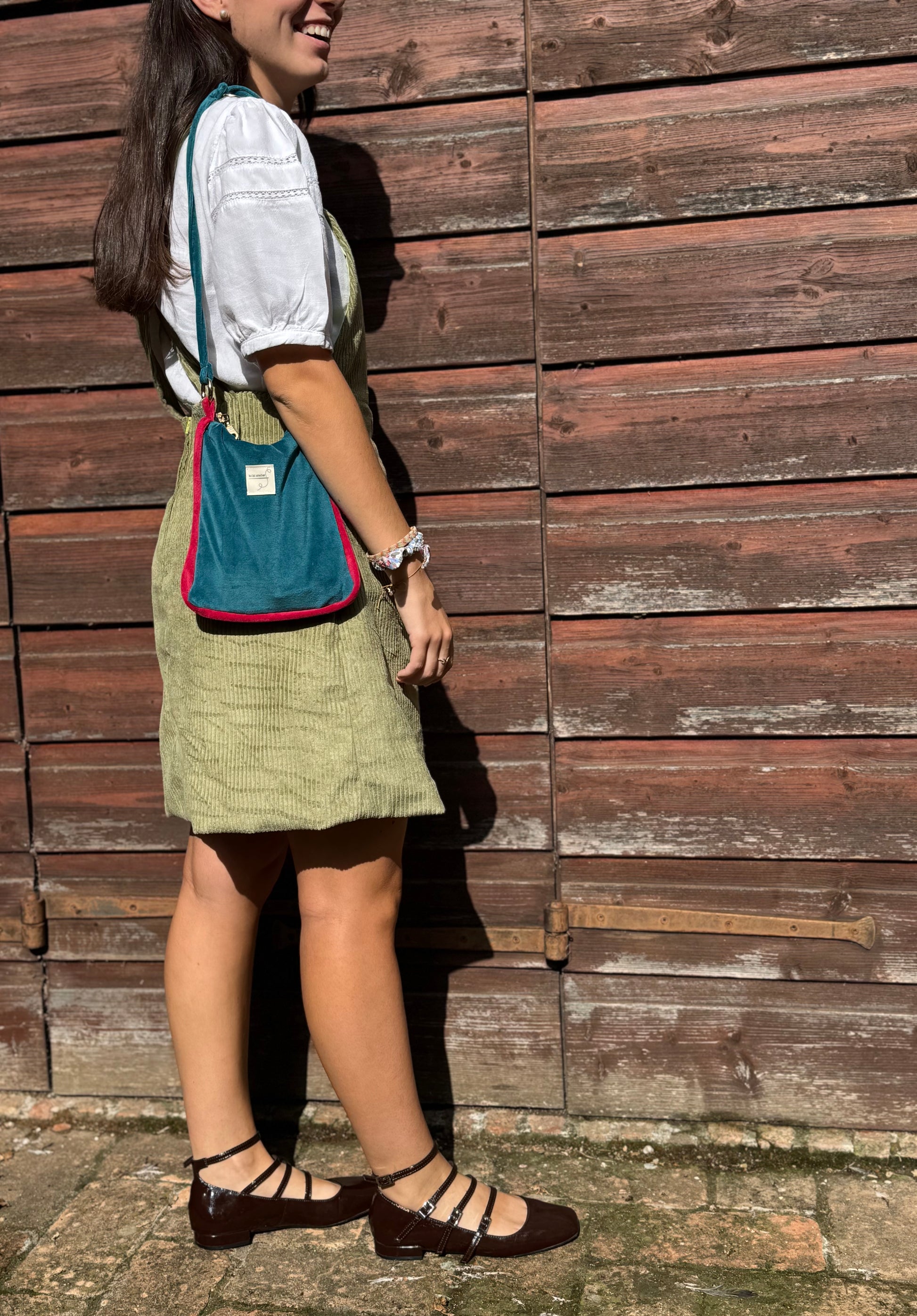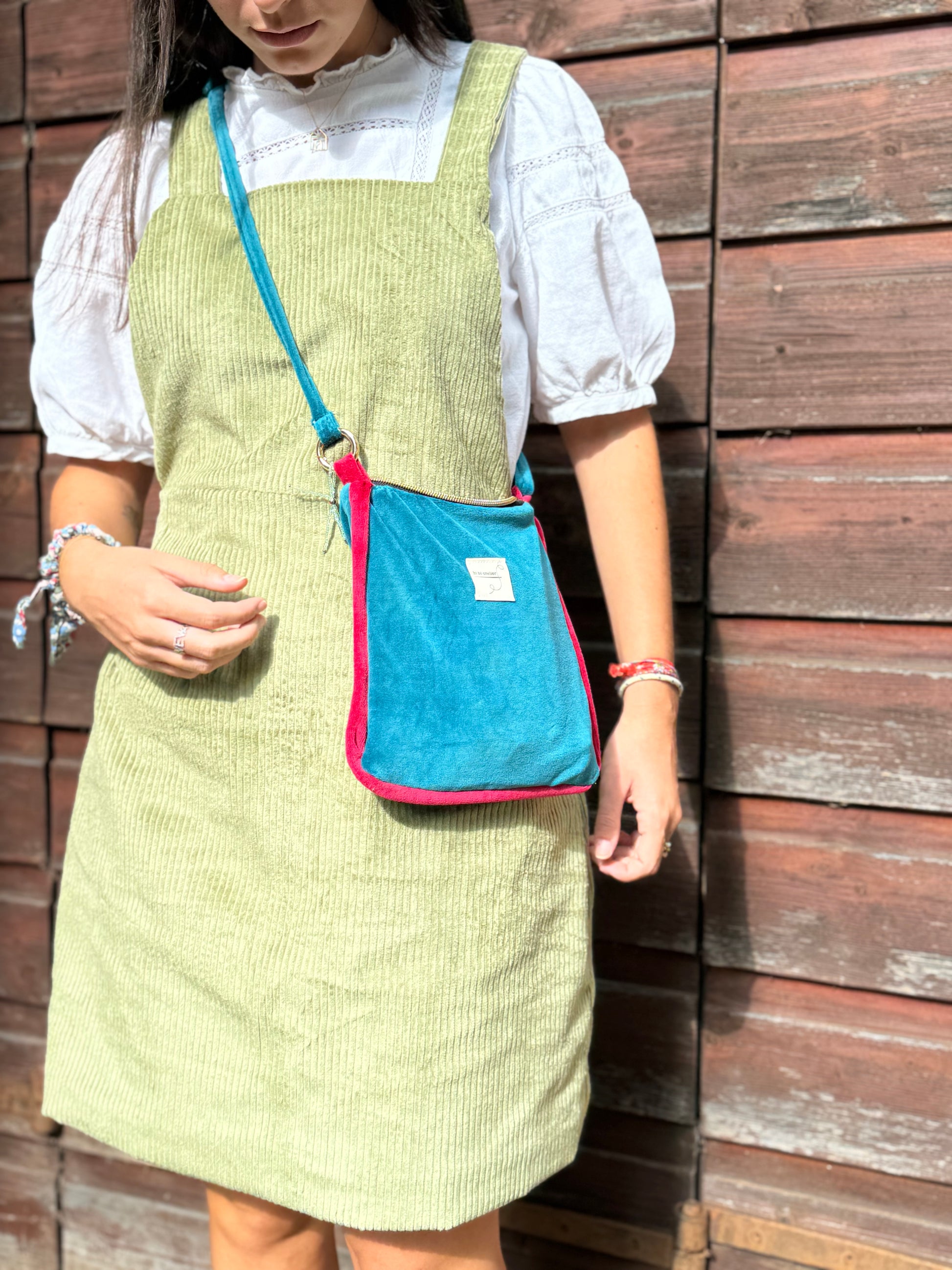Borsa in morbido velluto di cotone foderata in vichy, con orlino a contrasto.