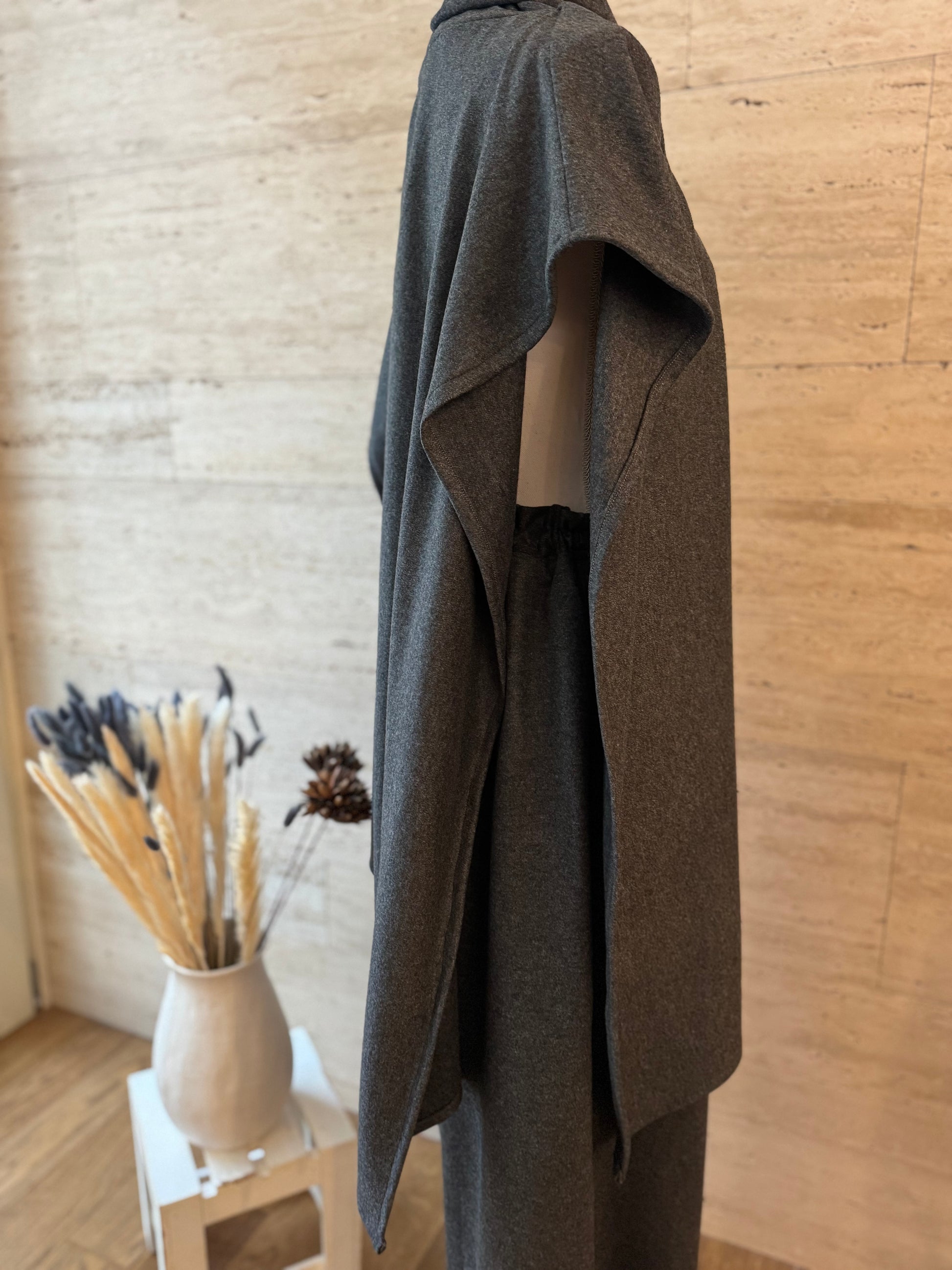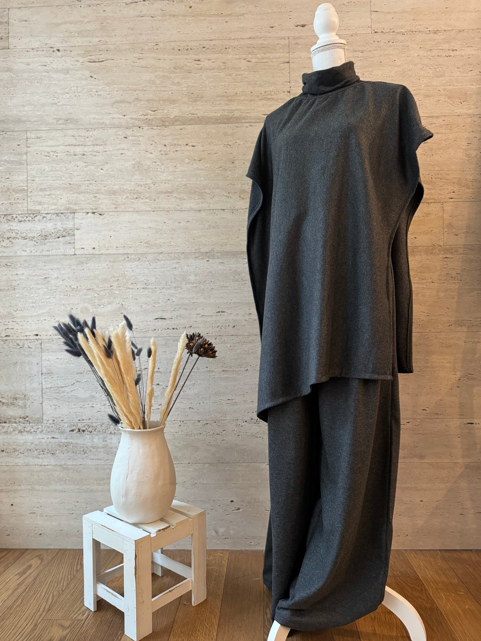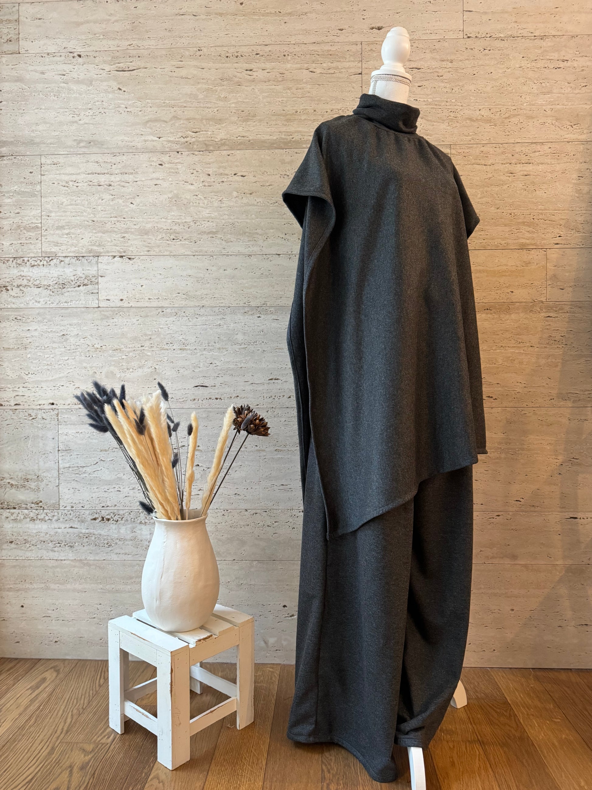 Completo in puro cashmere di avanzo dalle produzioni Loro Piana, con pantalone palazzo e maglia a poncho con collo alto.