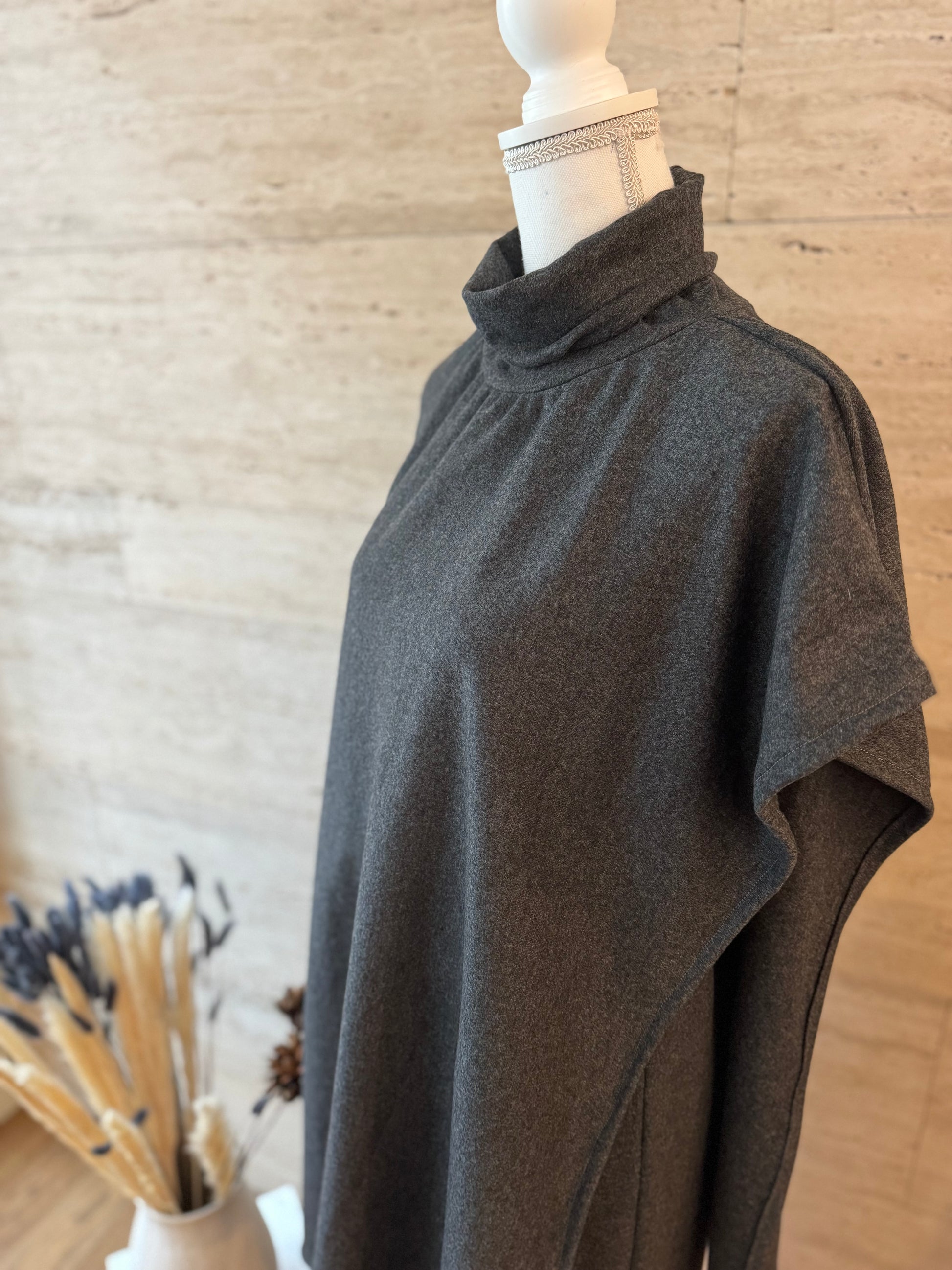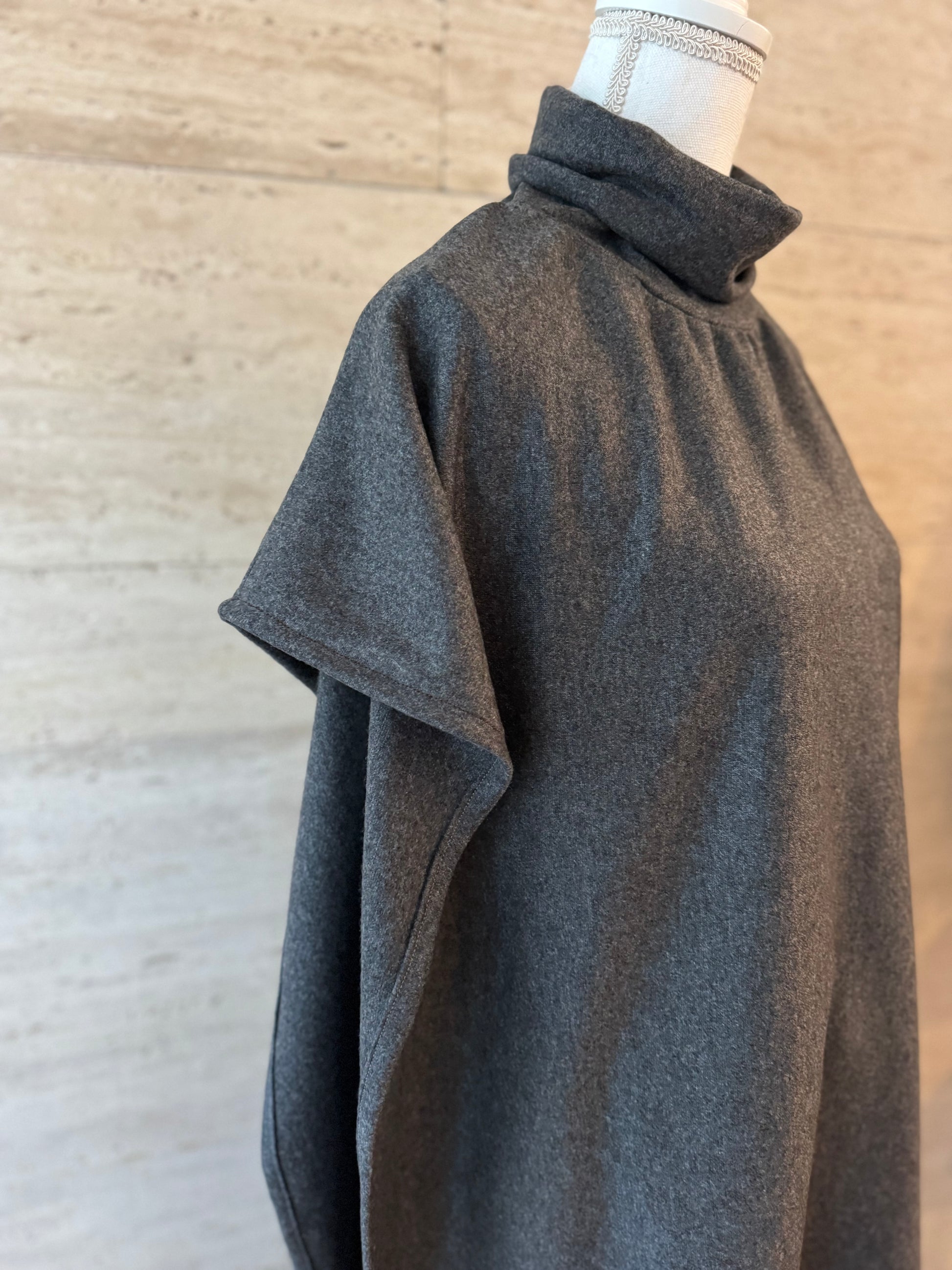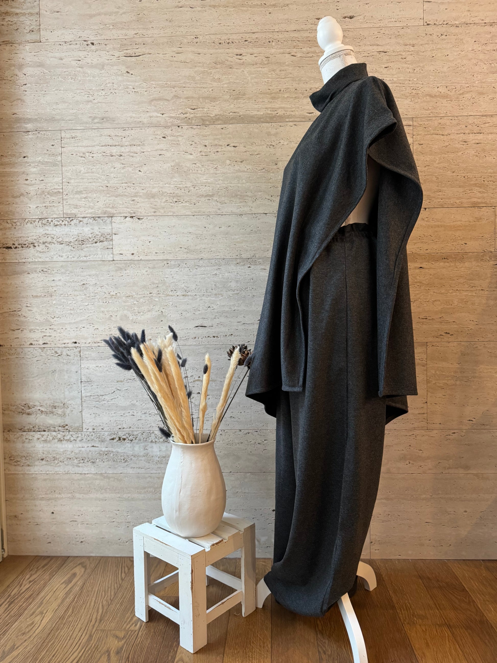 Completo in puro cashmere di avanzo dalle produzioni Loro Piana, con pantalone palazzo e maglia a poncho con collo alto.