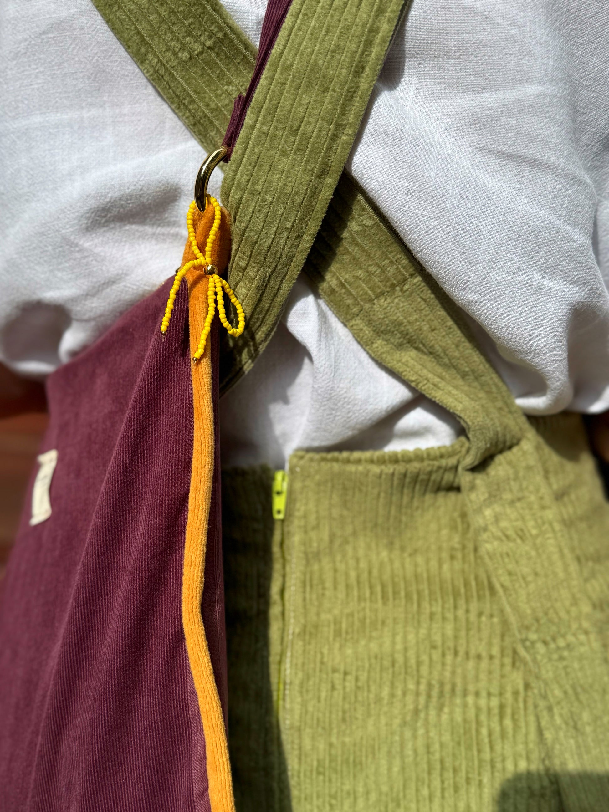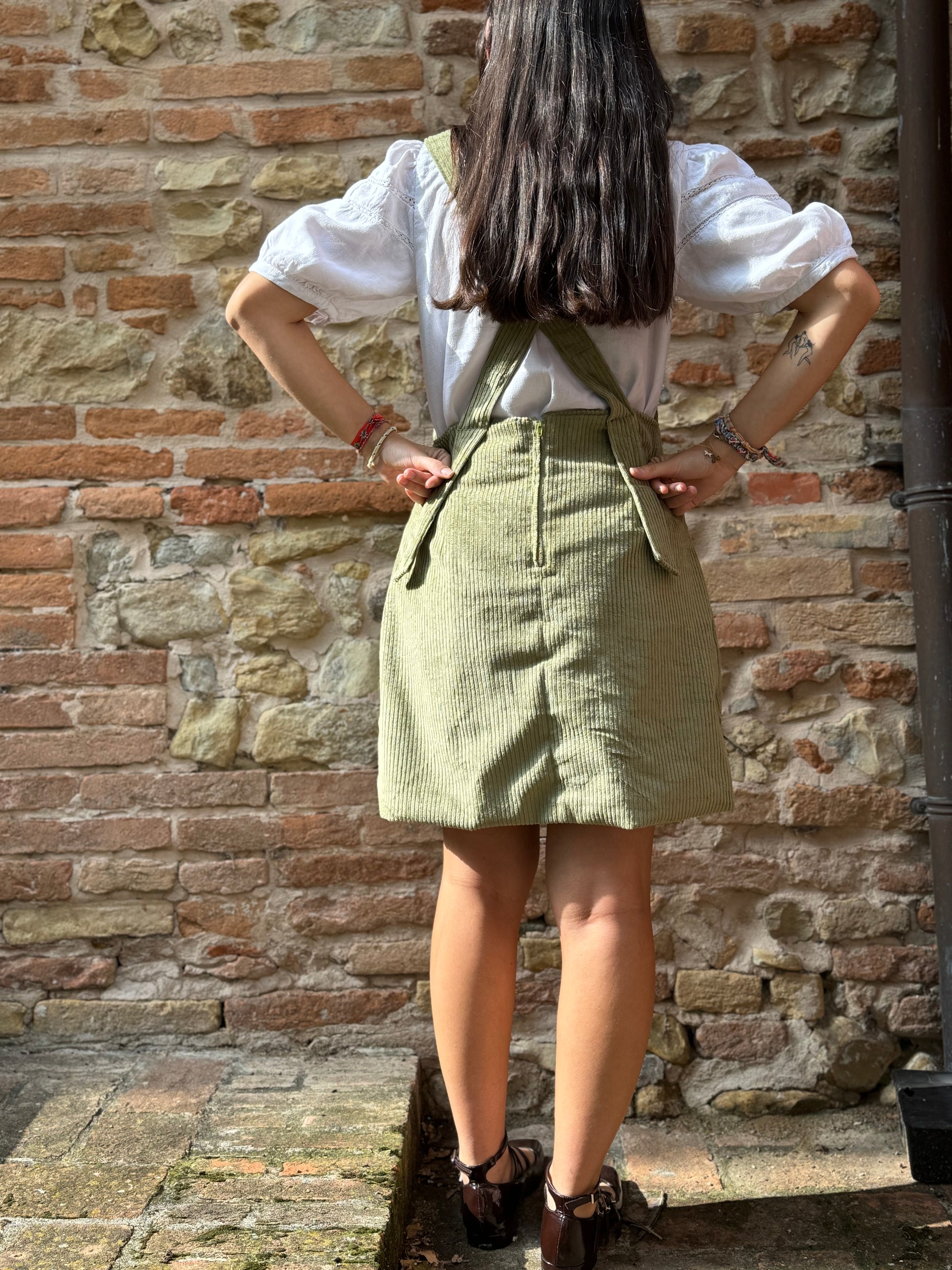 Salopette a gonna in morbido velluto di cotone, con spalline a incrocio sulla schiena.